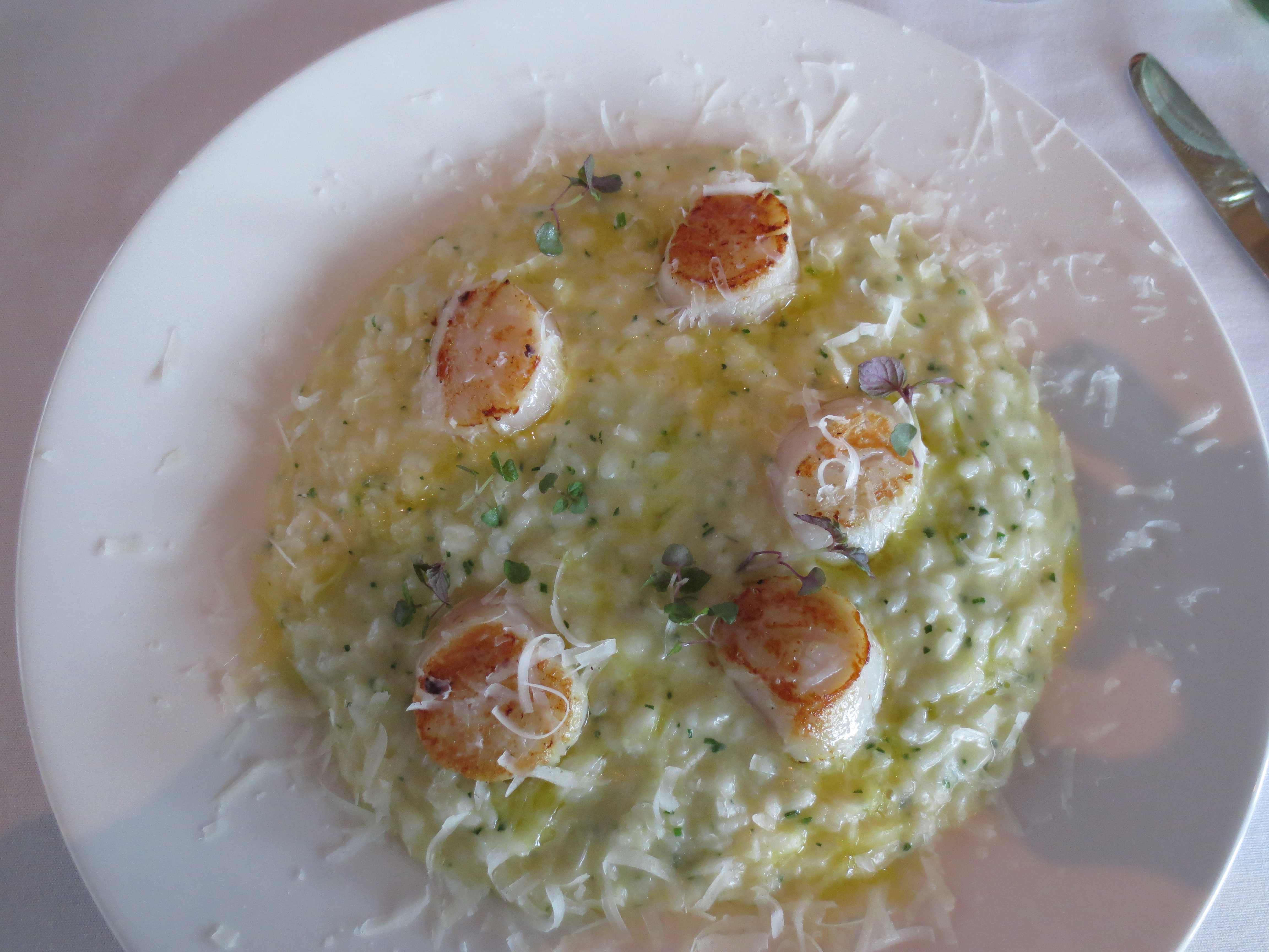 There were three mains – lamb rump with spiced eggplant, harissa, almonds and lemon, scallop risotto, and lemon and dill battered flathead with chips and salad, – we decided on the first two and weren’t disappointed.