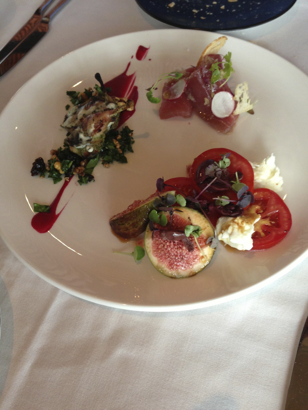 Entree is a shared plate, and ours was crudo of export grade tuna, Noosa tomato salad with Italian buffalo mozzarella, and BBQ’d quail with beetroots, walnuts and cherries.