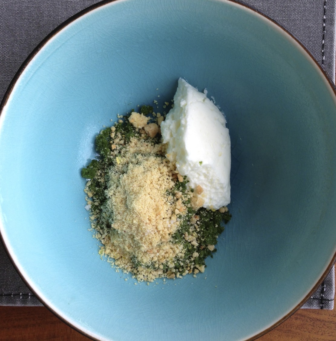 Sheep’s milk yoghurt with sorrel granita and peanut crumble.