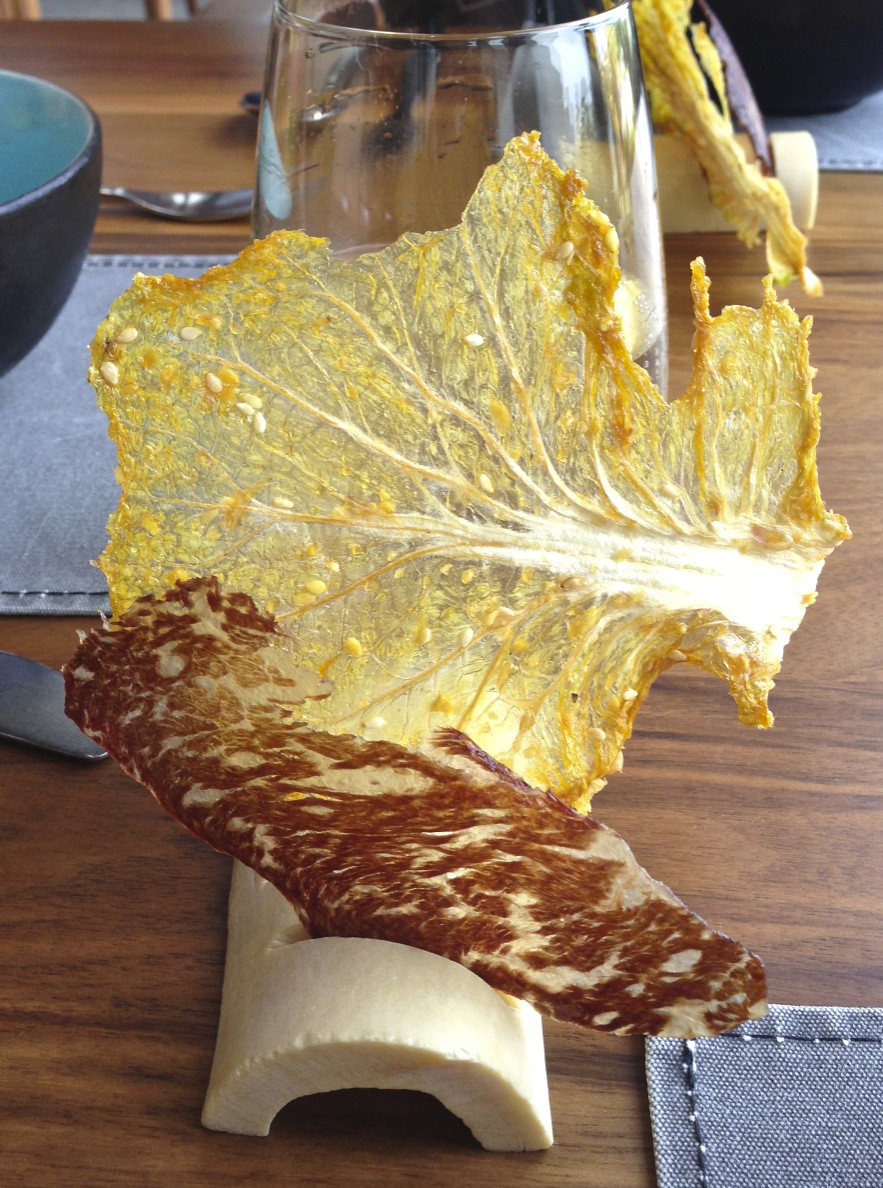 Dried beef with anchovies, and dried fermented cabbage served on a marrow bone.