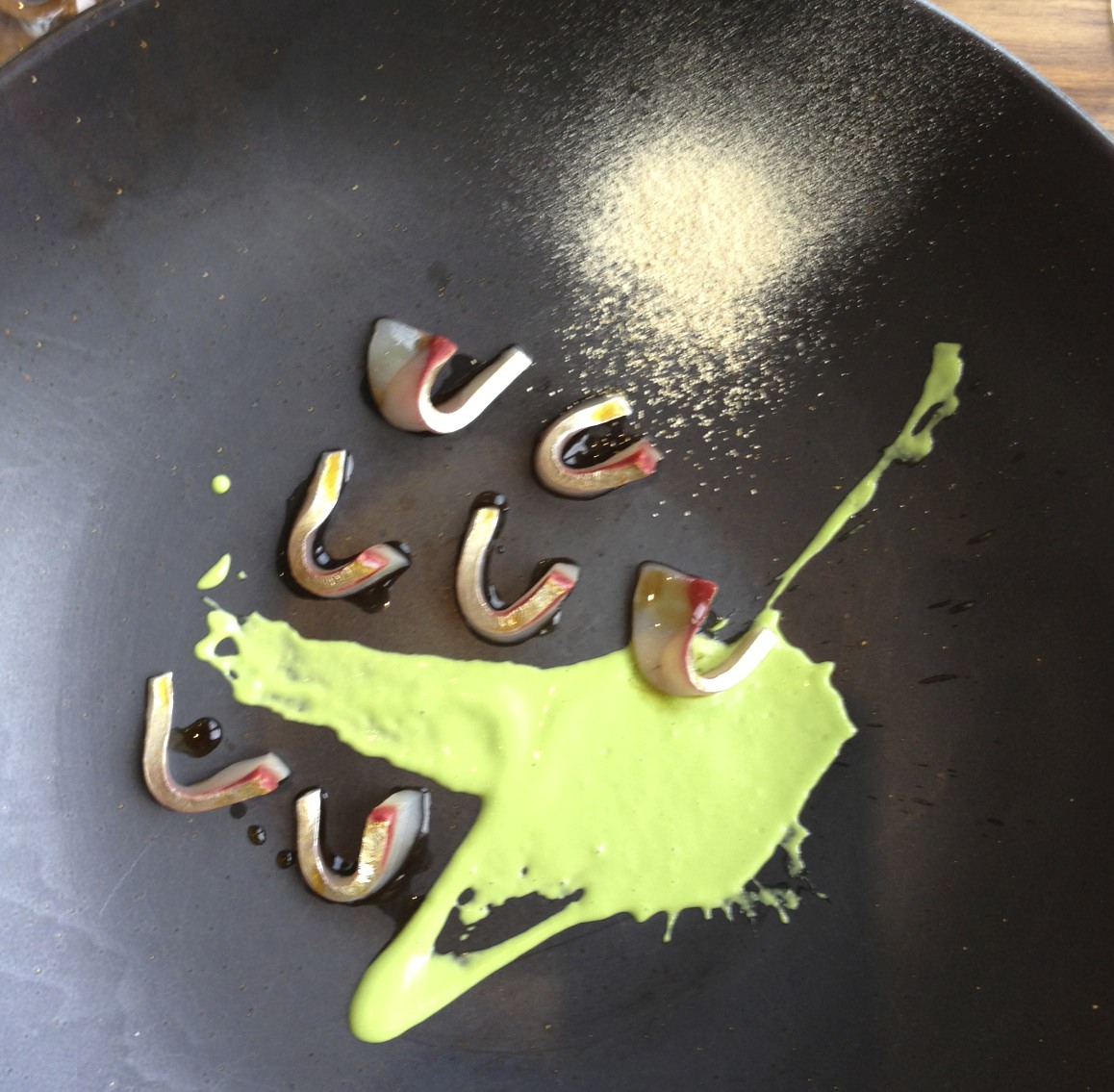 Sashimi of trevally with mustard leaf vinaigrette and shitaki powder.