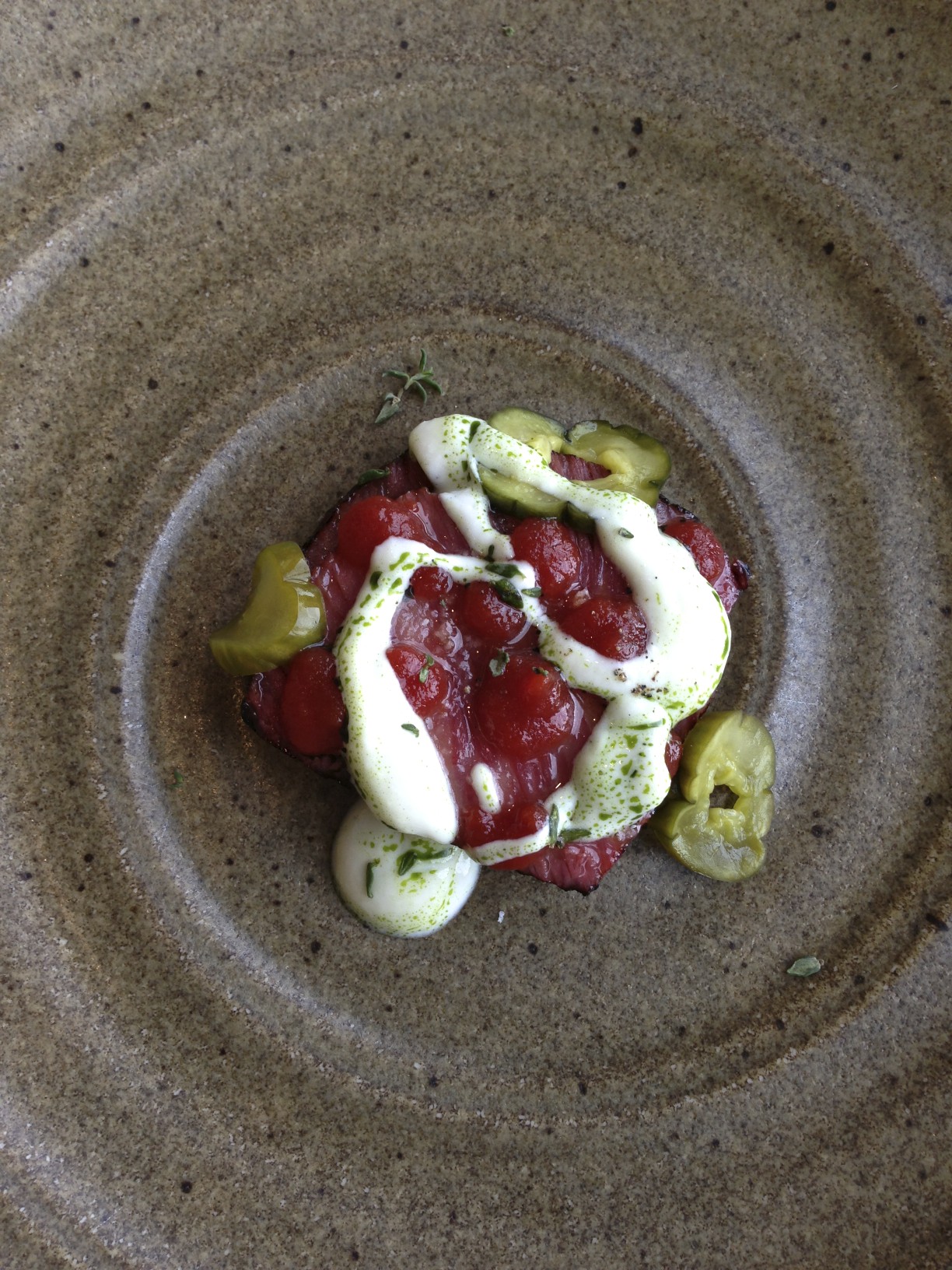 Grilled wagu corn beef with homemade ketchup, pickles and horseradish infused yoghurt.