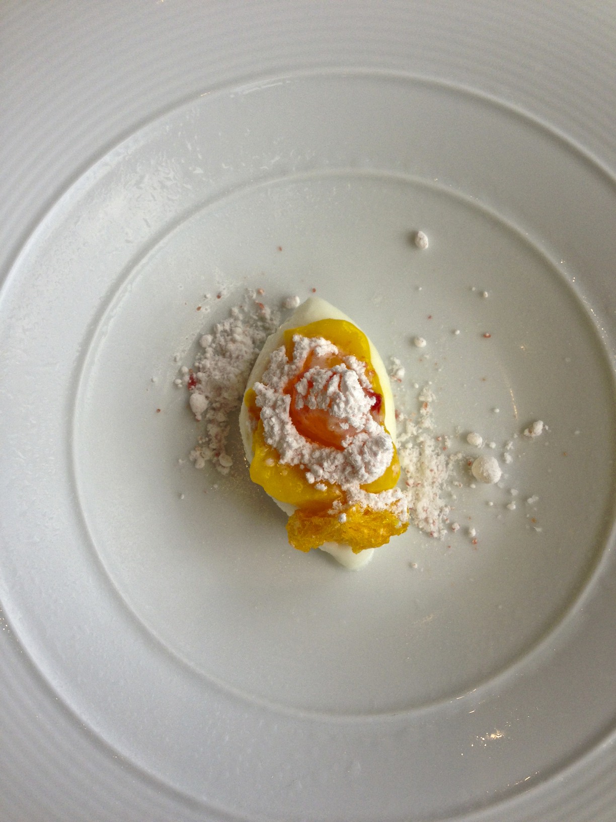 Curds and whey ice-cream, tangerine sorbet, orange jelly, freeze dried mandarin with campari crystals and campari sherbet.